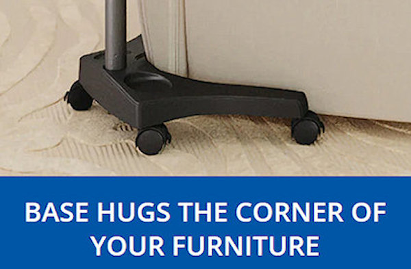 The Levo G2 V-16 Essential Stand actually has a wraparound base that will closely tuck itself around the corner of recliners, tables, stands, sofas or chairs, such that it doesn't stick out for someone to trip over. This maintains a clear pathway for walking.
