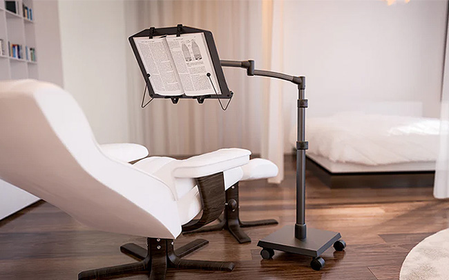 The word "levo" as derived from Latin, means 'to raise, lift up, relieve, or ease'. This is precisely what the Levo Bookholder & Book Stand does for you. This sturdy, aluminum floor stand relieves the stress and strain of having to hold your book; resulting in a more comfortable, ergonomic and relaxing reading experience.